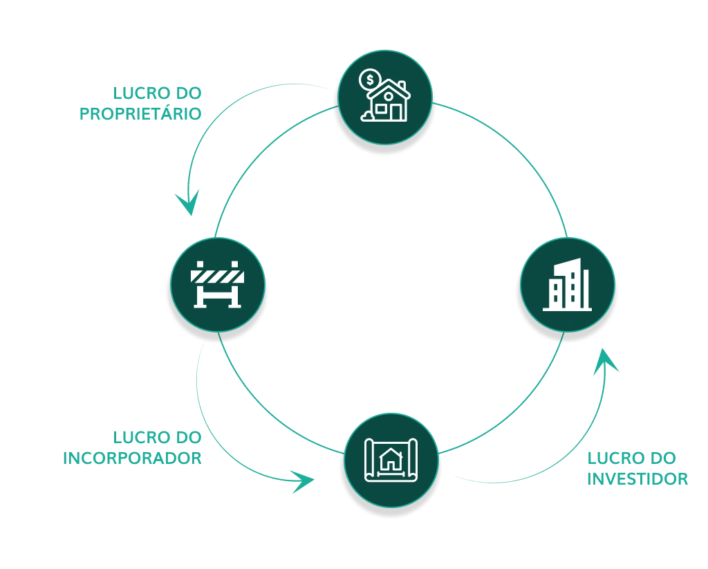 A união de diferentes investidores na aquisição de terrenos ou áreas, permitindo o acesso a grandes projetos para futura negociação de permuta.